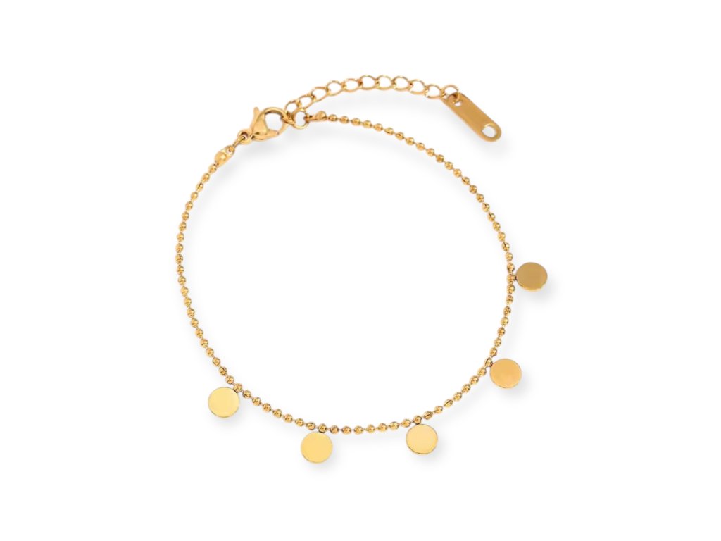 Elegantní a minimalistický náramek, který podtrhne ženskou jemnost a styl. Vyrobený z kvalitní nerezové oceli číslo 304 se zlatým povrchem, díky čemuž je odolný, stálobarevný, vhodný i pro každodenní nošení a nevadí mu ani voda.