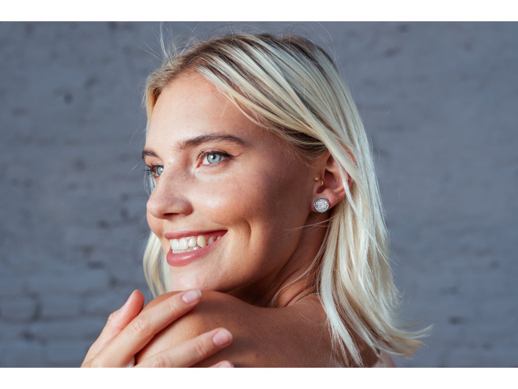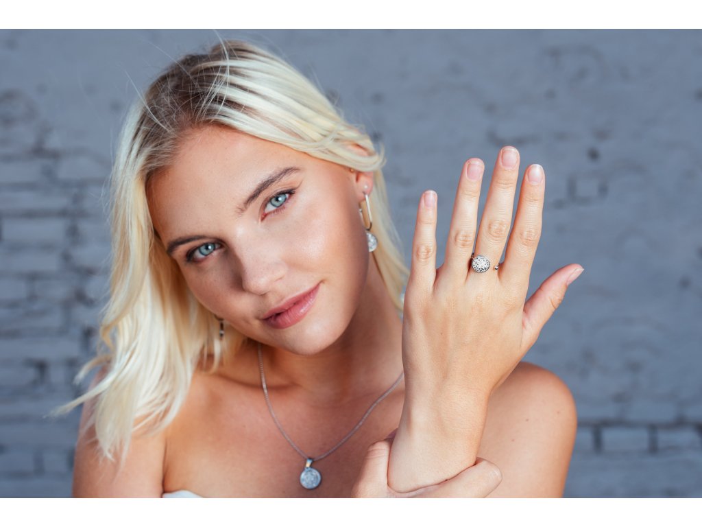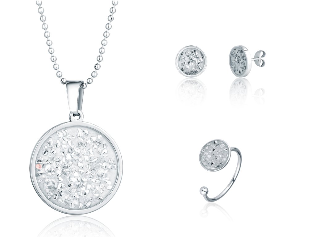 Set se skládá z náhrdelníku ve stříbrném provedení s lakovanými sklíčky, vyráběný ze speciálního šperkařského betonu a nerezového lůžka s průměrem 28 mm, délka řetízku je 45 cm se zapínáním na drobnou karabinku, dále z náušnic s průměrem lůžka 12 mm a z prstenu s průměrem lůžka 10 mm, prsten je univerzální velikost díky roztahovatelnosti. Vše balené v krásných dárkových krabičkách Betonbeads.