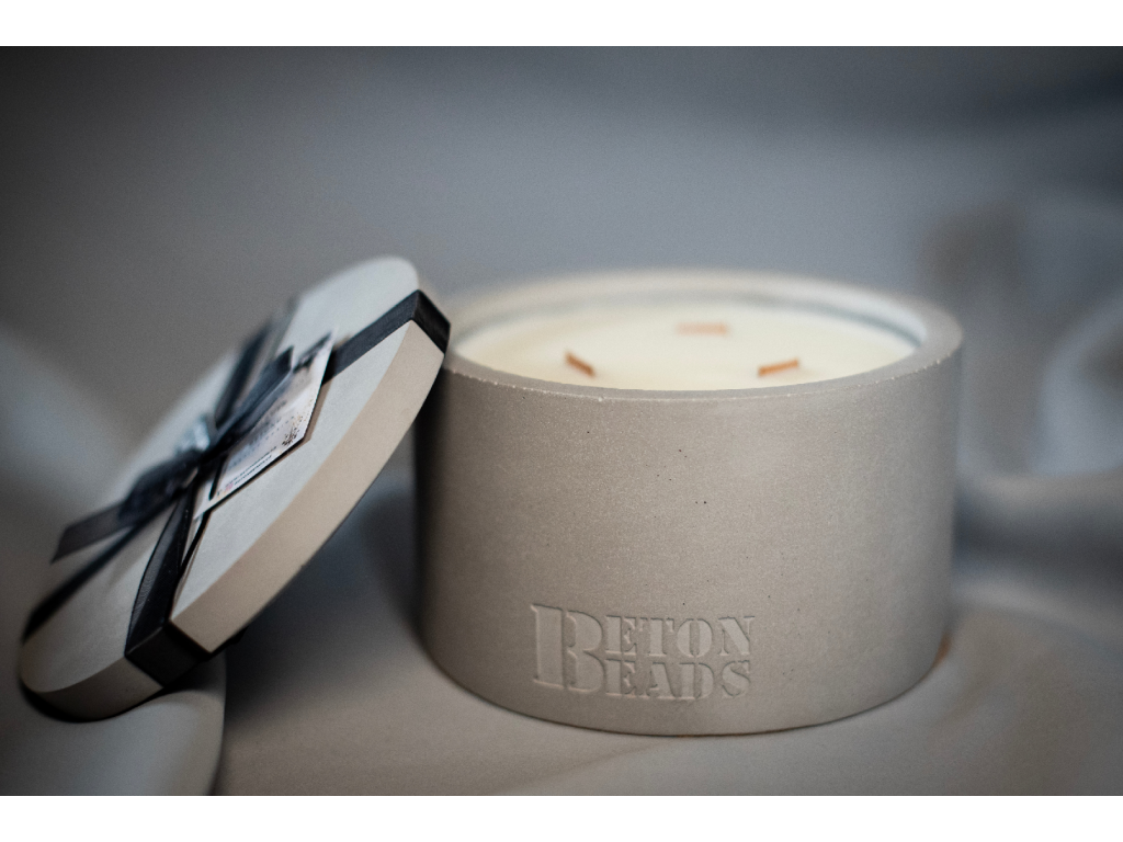 Luxusní betonová svíčka o váze 2400 gramů zaujme designem, sójovým voskem, luxusní vůní a třemi praskajícími dřevěnými knoty.